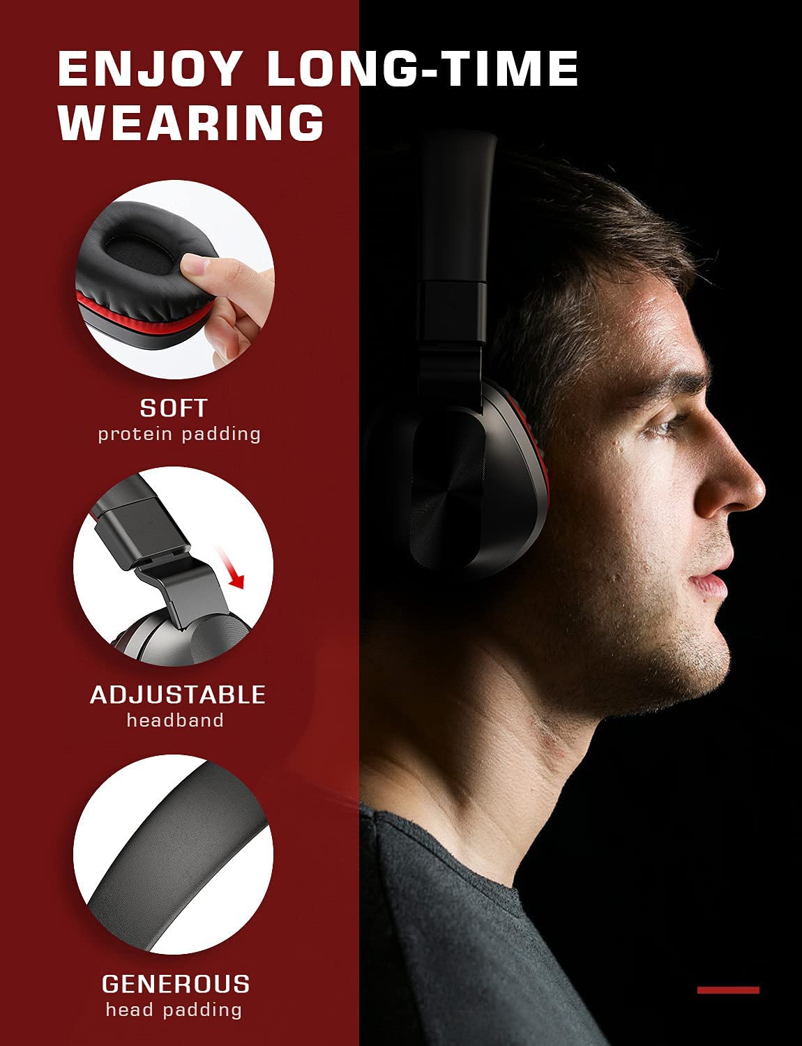 The cushioned earpads gently press your ears giving a noise isolating experience. The material is eco-leather, with cushions providing an ample amount of padding all around. Also, premium high-end materials make these noise cancellingВ headphones sturdy and durable.